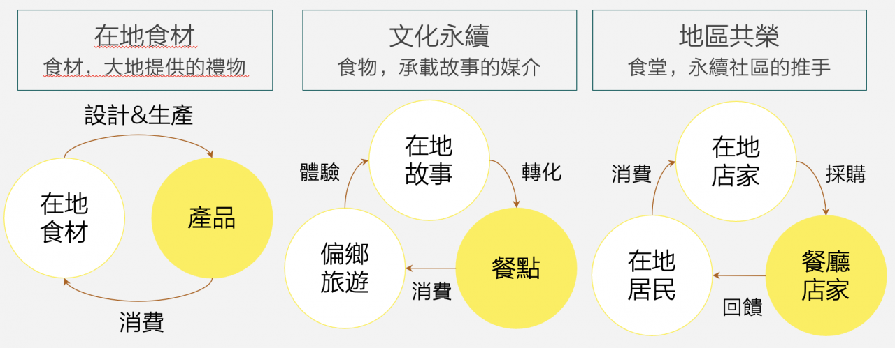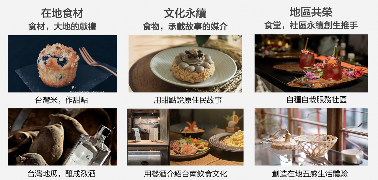 每個主題各搭配兩種不同的餐飲體驗。例如,在地食材,規劃「台灣米,作甜點」、「台灣地瓜,釀的烈酒」;文化永續,規劃「用甜點說原住民故事」、「用餐酒介紹台南飲食文化」;